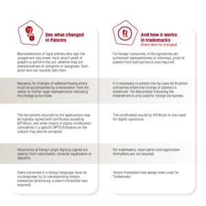 Updates on procedures for transferring ownership and changing the name/company name, address/headquarters, and security interest or pledge of patent holders of any nature have been released, as set out in articles 58, 59, and 60 of the Industrial Property Law – Law No. 9,279 of May 14, 1996 (LPI).